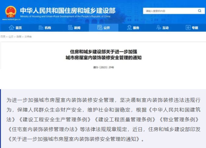 通知主要內(nèi)容如下:一、按照誰所有誰負責、誰使用誰負責的原則,城市房屋所有人、使用人(以下統(tǒng)稱裝修人)是房屋室內(nèi)裝飾裝修安全管理的第一責任人,實施房屋室內(nèi)裝飾裝修活動應當嚴格遵守有關法律法規(guī)規(guī)...